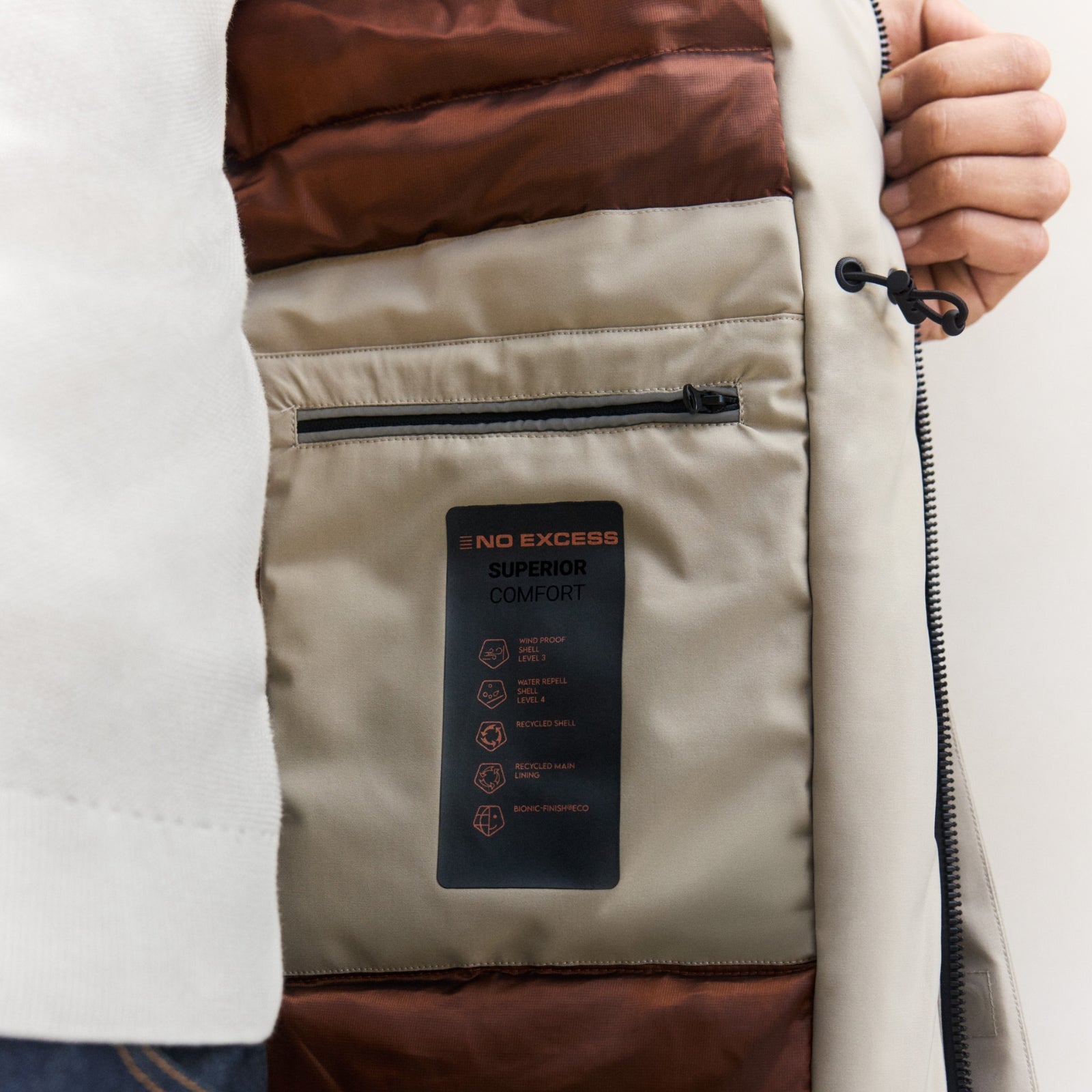Onze Jassen tonen het pictogram Recycled alleen als de buitenkant, vulling of voering het volgende bevat minstens 90% gerecycled materiaal.